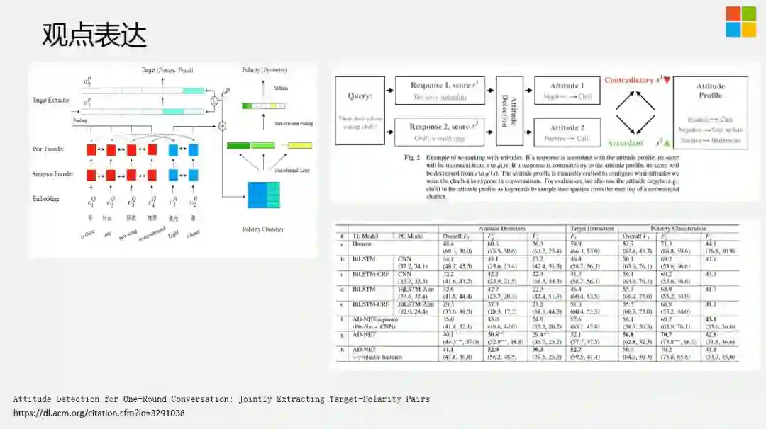 业界在做系统时,会把TAG提取和意图分开。特别是在做slot filling ( 槽位填充 ) 时,会先分意图,再做slot抽取。我们发现,如果把这两个工作组合在一起做,会有更好的效果提升。右上角是我们的一个做法,可以给她的观点根据不同的Entity,不同事物做设定,当有新的Response回来之后,会跟当前的设定做逻辑一致性校验,比如喜欢吃辣的或者不喜欢吃辣的,Response如果是吃火锅,对应的就是喜欢吃辣的,如果人设是不喜欢吃辣的,那么这种Response需要尽可能的去掉。更多详情可参考原论文。