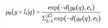 我们认为C1 ( 见上图 ) 是对应的类的中心点,同样C2,C3也是各自对应的类的中心点。当一个新的Query来了之后,我们会对新的Query也进行建模,得到一个表达X,当前的X跟已有类别的distance,可以通过下面的方式,进行衡量: