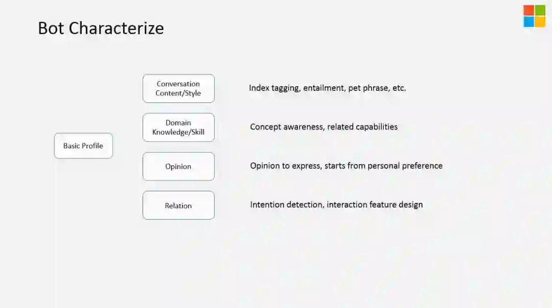 在我们内部机器人的基本特征如上,主要包括四部分:Conversation Content/Style、Domain Knowledge/Skill、Opinion、Relation。