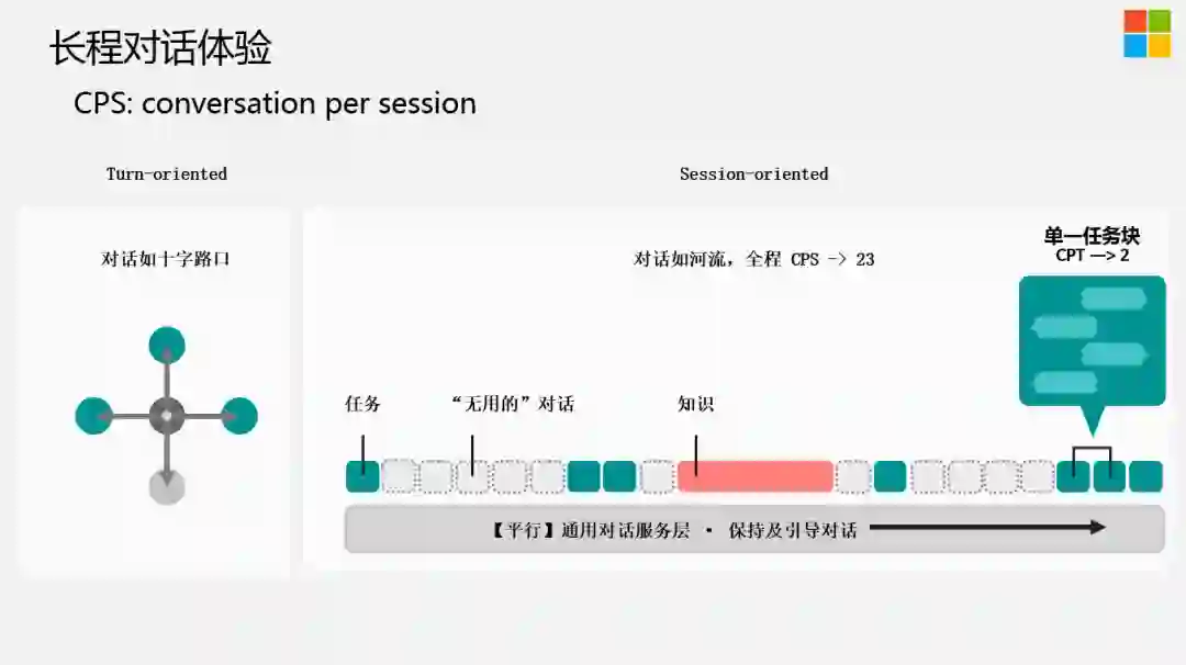 实际上,我们一直以Session-oriented来设计整个对话系统。左边是业界比较传统的做法,把它散漫出来,就是当用户站在对话的某一时间节点时,可能背后会有很多的意图,很多的分类,这时需要做一个决策,到底是往A、B、C哪个方向走?跟我们人与人之间的对话交流相似,对话应该像河流一样,在实际的沟通过程中,并不是每一句话都有特别的信息量,并不是每一句话都是在做任务或者搜索。这些无用的对话,由于穿插在这些任务或者知识的获取中,并且前面有些无用的对话可能会对后边的推荐或者任务有帮助,所以我们可以把这些潜在的意图给挖掘出来加以利用。举个例子,也是业界在做对话系统时忽略的一点,就是大家会把对话当做一个系统中单纯的技能来对待,把聊天,查天气,讲笑话等摆在同等的维度。我们觉得大家普遍低估了对话的魅力,以及对话场景下,可以挖掘到的宝藏,为什么?