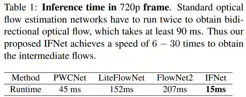 如下表 1 所示,研究者将 IFNet 与当前的 SOTA 光流估计网络的运行时进行了比较。目前基于流的模型通过需要运行两次才能得到双向流,而本研究中间流估计过程的运行速度较以往方法缩短了 6 至 30 倍。因此 IFNet 为开发实时流 VFI 算法提供了可能。