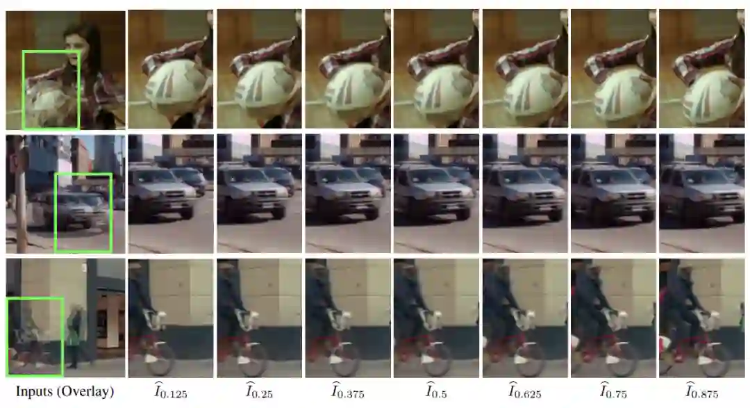 为了评估本文模型在多帧生成方面的能力,研究者分别提供了 Vimeo90K 测试集中大幅动作的 2×、4× 和 8× 结果,如下图 6 所示。可以看出来,RIFE 能够生成平滑而连续的运动。