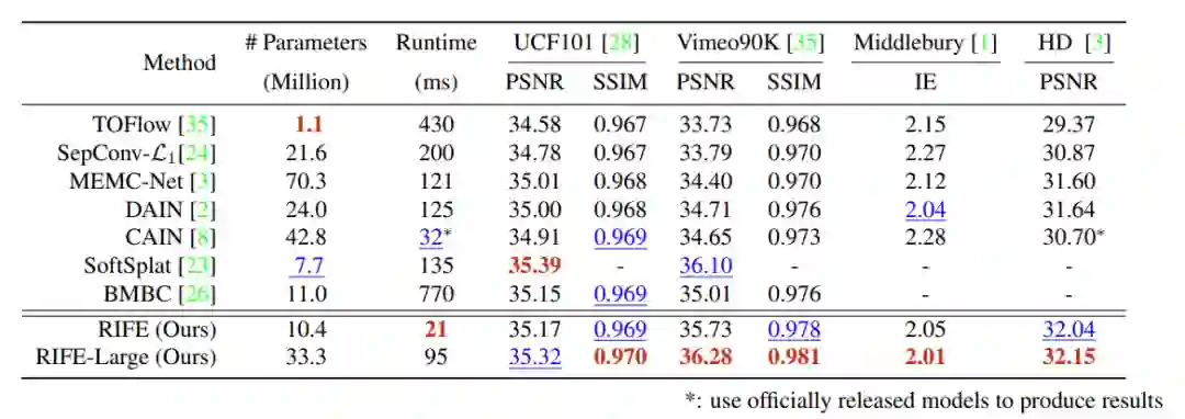 如下表 2 所示,研究者使用英伟达 TITAN X GPU,按照 640 × 480 的输入分辨率,在多个基准和运行速度的情况下对性能进行了测试。结果显示,基础模型 RIFE 的运行速度快于所有对比方法。此外,RIFE-Large 在多个基准上比之前的 SOTA 方法 SoftSplat 快 30%。
