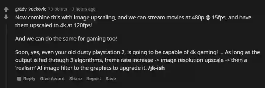 对于这种实时中间流估计算法,网友对其效果大加赞赏,并表示:「这种算法同样适用于游戏,很快老旧的 PS2 也能玩 4K 游戏了。」