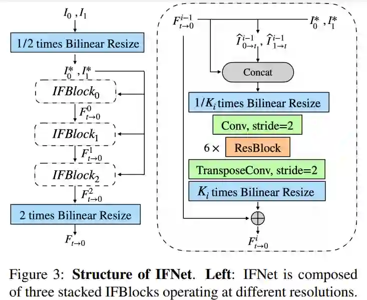 IFNet 的结构如下图 3 所示。IFNet 的作用是在给定两个连续输入帧 I_0 和 I_1 的情况下直接且高效地预测出 F_t→0。