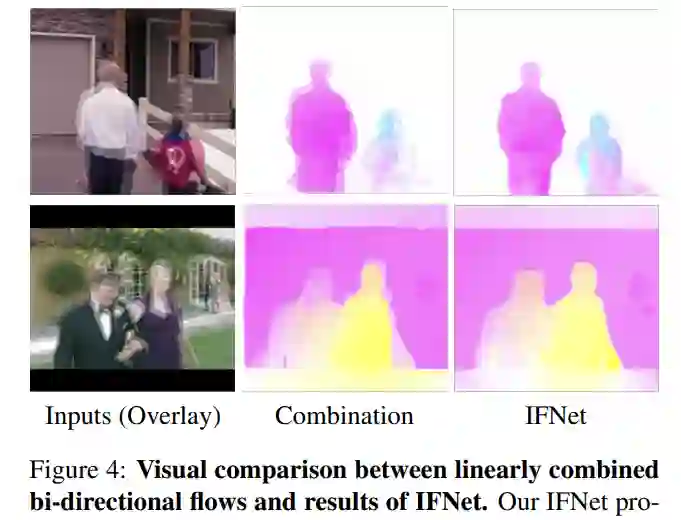 在下图 4 中,研究者提供了 IFNet 的视觉效果,并与预训练 LiteFlowNet 生成的线性组合双向光流进行了比较。结果表明,IFNet 生成了清晰的运动边界,而线性组合流出现了像素重叠和模糊的运动边界。