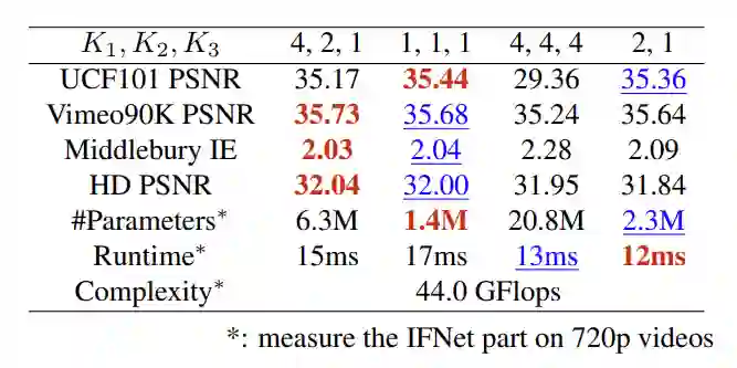 表 4:在 IFBlock 上不同的比例设置。IFNet 采用的是 (4, 2, 1) 设置, (1, 1, 1) 的组合只能在 UCF101 这种分辨率有限(256 × 256)的数据集上获得更好的性能。