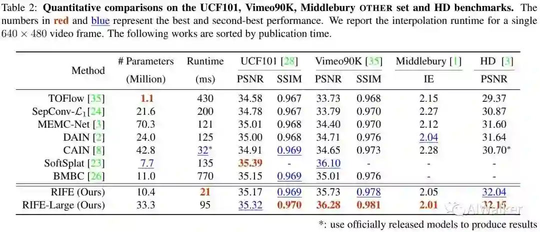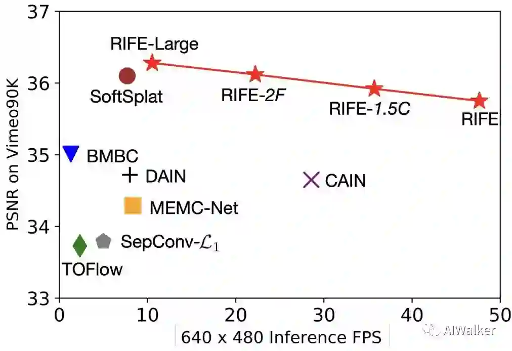 作者在几个公开数据集上进行了验证,所提RIFE具有更快的推理速度,同时取得了SOTA指标,见下图。
