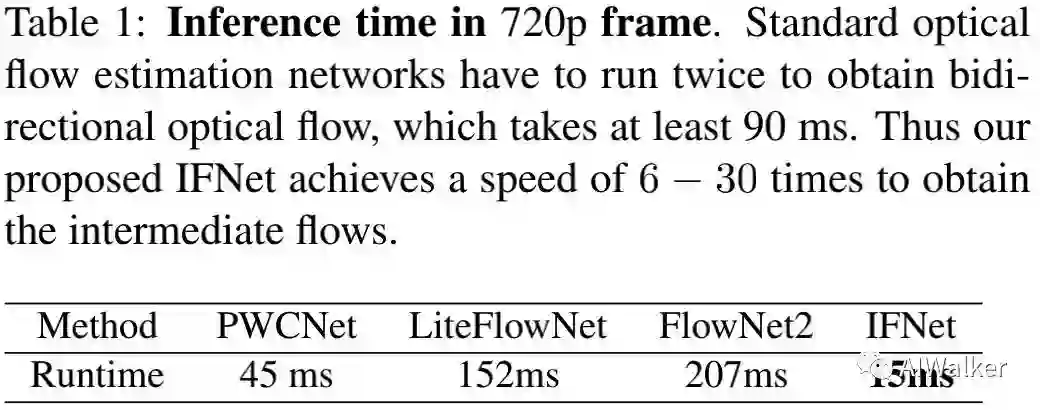 另外一点需要注意的是:IFNet仅需要进行一次光流估计。这也就导致了RIFE中的光流部分的推理耗时更快,对比见下表。可以看到:IFNet比其他视频插帧中的光流估计模块的速度快6-30倍。
