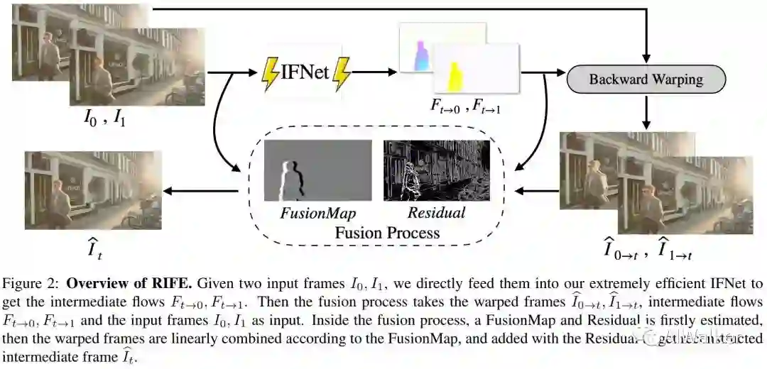 上图给出了该文所提出的RIFE框架流程,它包含IFNet、Backward Warp以及Fusion Process三个模块,其中IFNet与Fusion部分是该文的核心创新点所在,所以在接下来的内容中我们将主要围绕这两个点进行介绍。