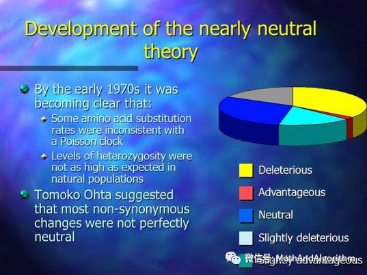 1968年,日本学者木村资生根据分子生物学的研究资料,首先提出了分子进化的中性学说,简称“中性学说”或“中性突变的随机漂变理论”。向达尔文的自然选择学说提出了挑战。此后,许多学者又根据大量的研究成果予以肯定。美国学者J.L.金和T.H.朱克斯用大量分子生物学实验和资料肯定了这一学说,并把这一学说称为非达尔文主义。20世纪50年代,科学家们先后搞清了不同生物体内具有相同功能的一些蛋白质的氨基酸序列和核酸的核苷酸序列。他们发现,生物间的亲缘关系越近,这些生物大分子间的差异越小;亲缘关系越远,差异越大。科学家们还发现,随着生物由低级到高级的演化,同一种分子中的氨基酸或核苷酸以一定的速率置换着,有就是说每一种生物大分子不论在哪种生物体内,都以一定的速度进化着。例如,各种脊椎动物血红蛋白分子α链中的氨基酸,都是以每年大约10个的速度置换着,并且置换的速度与环境的变化和生物时代的长短无关。这种分子水平上的置换是由基因突变造成的,其中多数对生物的性状既没有表现出有利也没有表现有害,属于中性突变或近中性突变。例如,决定苯丙氨酸的密码子可以是UUU,也可以是UUC,如果RNA分子中的一个碱基被置换(U→C),使UUU突变成了UUC,新密码的意义与原密码的相同。由于中性突变对生物的生存和繁殖能力没有影响,自然选择对它们也就不起作用。它们在种群中的保存、扩散和消失完全是随机的,这种现象称为随机漂变。随机漂变经过日积月累,积少成多,会使同种生物的不同种群间出现巨大的差异,就可能形成不同的物种。该理论认为:生物在分子水平上的进化是基于基因不断产生“中性突变”的结果,它也是在群体中产生的,而不像综合进化理论所主张的突变有好有坏那样,而这种“中性突变”既无好处也无坏处。它并不受自然选择的作用,而是通过群体内个体的随机交配以及突变基因随同一些基因型固定下来或消失不见(即被淘汰掉),新种的形成主要不是由微小的长期有利变异积累而成,而是由那些无适应性的、无好坏利害之分的中性突变积累而成。即生物在分子水平的大多数突变是中性的或近似中性的,它们既没有好坏利害之别,又没有适应和不适应之分,因此自然选择对它们不起作用。中性学说的出发点是中性突变,在中性突变过程中,哪一种变异能够保存下来,哪一种变异趋于消失,全靠机遇,而不是达尔文的自然选择,这个过程叫做“遗传漂变”。由于它完全不受自然选择的作用,实际上就否定了自然选择,甚至还认为生物进化与环境无关,故此理论是“非达尔文主义”的。该学说对认识物种进化的贡献在于:揭示了基因突变在分子水平上进化的特殊性,这为达尔文主义和综合进化理论所不及。但它最大的缺陷是解释不了“基因型”(也就是某种可能性)怎样变成“表型”(也就是现实性)以及物种形成的原因,因此,它在解释生物进化上仍是不足的。在目前的科学条件下,它可以看做是达尔文进化论(包括综合进化理论)的补充和发展。100多年来,进化论经受了各种考验,同时也在不断从科学发展中吸取营养,进化论的研究正从原来的个体进化水平向群体进化水平发展,进化论也在不断地进化中,另一方面它又朝着分子进化水平纵深发展。