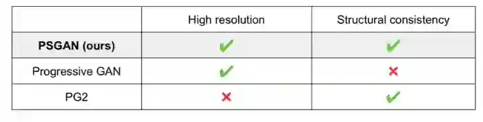 上图所示是用 Progressive GAN [Karras+18] 和 PSGAN 在 DeepFashion [Liu+16] (256*256) 数据集上生成的图像。通过观察可以看出 Progressive GAN 不能生成与全局结构一致的自然图像(例如左边四张图)。而 PSGAN 可以通过在每个尺度上添加结构条件生成与全局结构一致的合理图像。