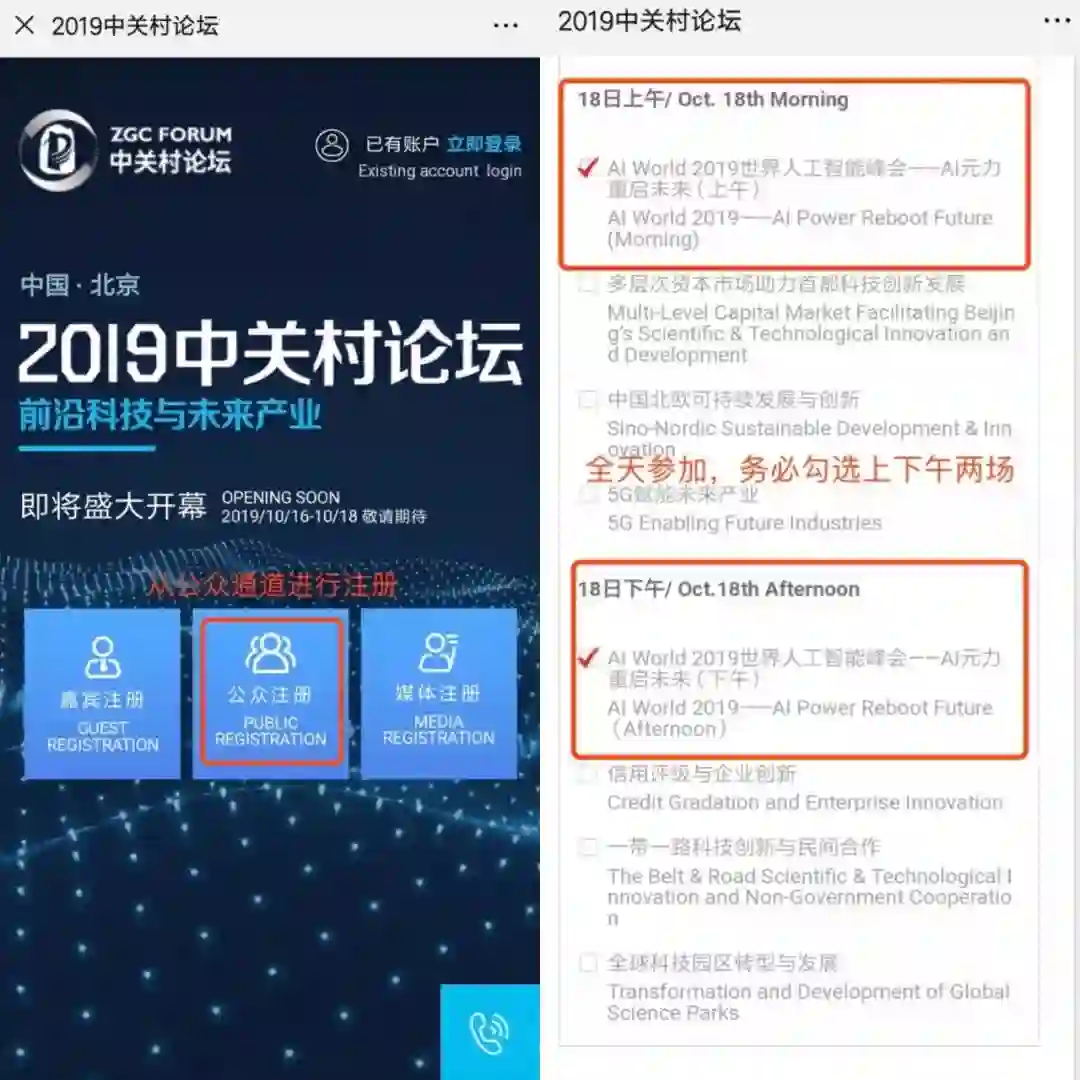 只需点击文末“阅读原文”即可跳转至报名页面,选择“公众注册”,按照页面要求填写注册信息即可。请务必勾选您要参加的场次,如果上、下午场都参加请勾选“AI World2019峰会上午场和下午场”。由于报名人数较多,参会资格需要审核通过,还望理解。