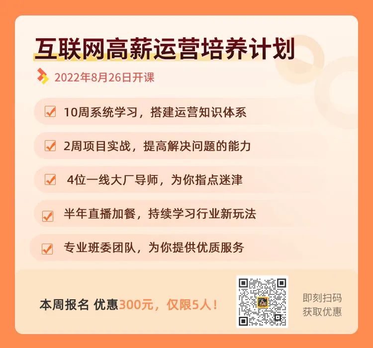 今天给大家推荐《互联网高薪运营培养计划》,用10周时间,从0-1,补齐各个模块的能力,搭建起运营系统知识体系,为升职加薪做好充足准备!