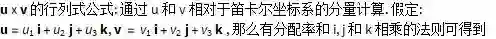 空间两个非零向量 u 和 v. 如果 u 和 v 不平行, 那么就确定了一个平面. 这样可以用右手法则选择一个垂直于这个平面的单位向量 n. |u×v| 是平行四边形的面积.