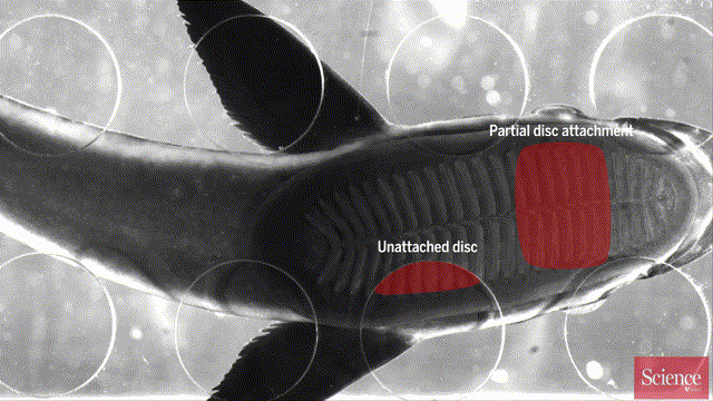 在观察生物䲟鱼吸附时,课题组发现了一个非常有趣的现象,䲟鱼只依靠吸盘的一部分即可吸附在带孔的表面上。