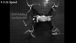 课题组创新性地设计了一种简单、低成本的可折叠螺旋桨,其在水下可以自适应折叠,在空中可以被动展开。使得螺旋桨在两种介质中的工作转速区间减小,缩短了工作转速的切换时间。相比于使用普通螺旋桨,机器人的跨越介质时间缩短了61.1%,显著提升了机器人跨越水/空界面的速度。
