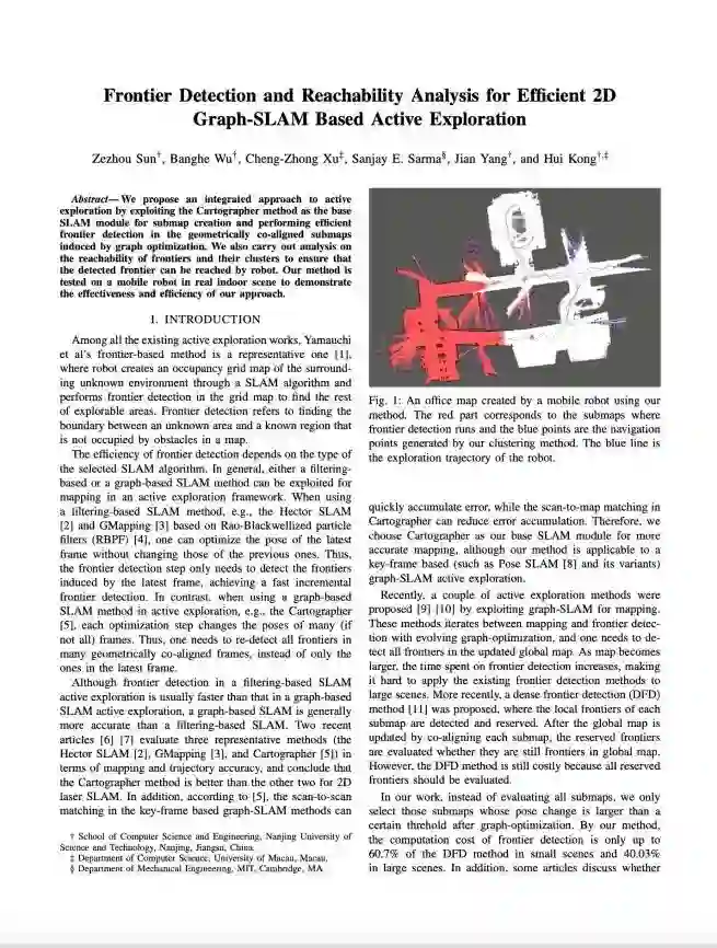 Zezhou Sun, Banghe Wu, Cheng-Zhong Xu, Sanjay Sarma, Jian Yang, and Hui Kong, Frontier Detection and Reachability Analysis for Efficient 2D Graph-SLAM Based Active Exploration, IEEE International Conference on Intelligent Robotics and Systems (IROS) 2020 (oral presentation)