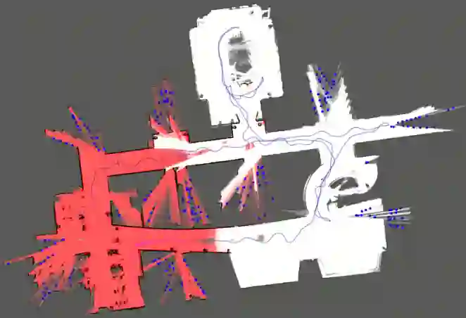 图1:移动机器人建立的室内地图。红色部分对应于进行边界检测的子图,蓝色点为通过论文方法生成的导航点,蓝线是机器人的探索轨迹。