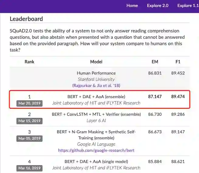 科大讯飞能够完成完成可回答问题,识别并拒绝无法回答的问题,最终刷新机器阅读理解能力纪录,与背后的参赛模型 BERT + DAE + AoA 息息相关。下面是关于这个模型的详细工作原理和性能表现数据: