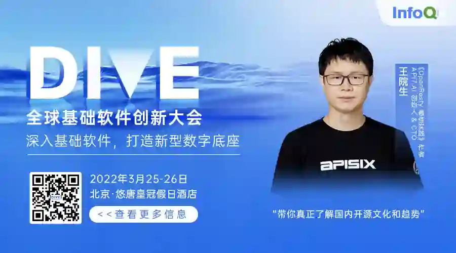 3 月 26 日,王院生将于 DIVE 全球基础软件创新大会的《基础软件人才培养和发展》专题中,带来“开源浪潮下基础软件人才培养和实践”的分享。希望借本次分享,能透过 Apache APISIX 开源项目的视角,系统阐述开源项目与基础软件人才的关系以及成长模式,让观众从实例中了解如何进行公开透明的全球协作,以及如何培养和吸引人才。“开源项目没有黑魔法,只有解决实际生产问题才有根基。”