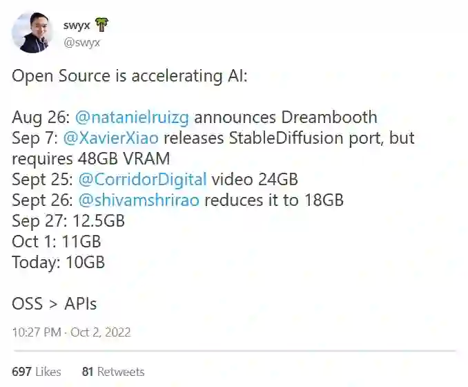 2022年8月26日,Dreambooth宣布诞生;12天后公布了开源端口;又过了25天后,训练Dreambooth的所需内存空间降低了79%;10月8日,Dreambooth已经能在8GB GPU上训练。