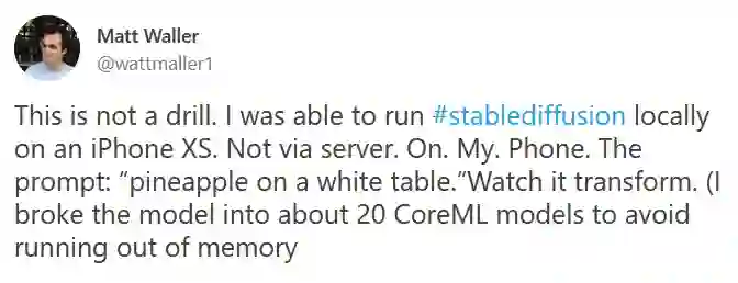 现在,容易优化的地方都已优化完毕,于是有人开始担心:继续优化下去的投入产出比会越来越低,但后来这种担心不攻自破。8月份时,Stable Diffusion可以在内存为5~10GB的GPU上运行——商用GPU的内存一般为6~12GB,苹果产品都有统一内存(Unified Memory)。到了9月,Stable Diffusion已能在iPhone XS上运行。