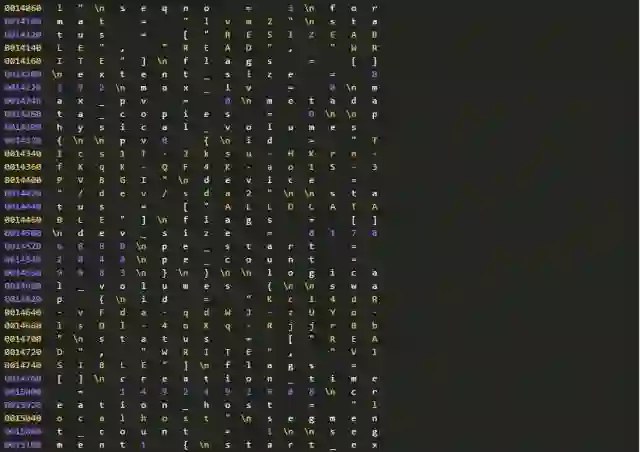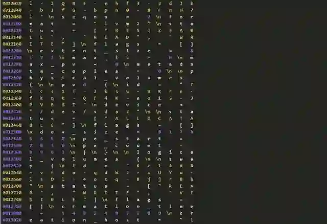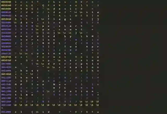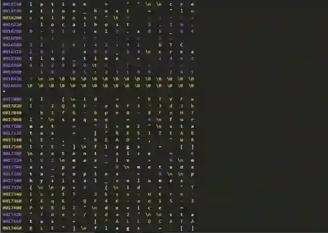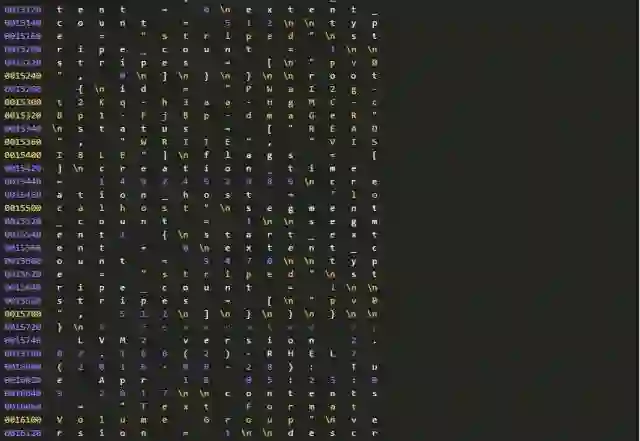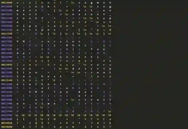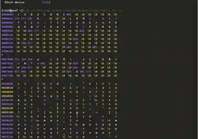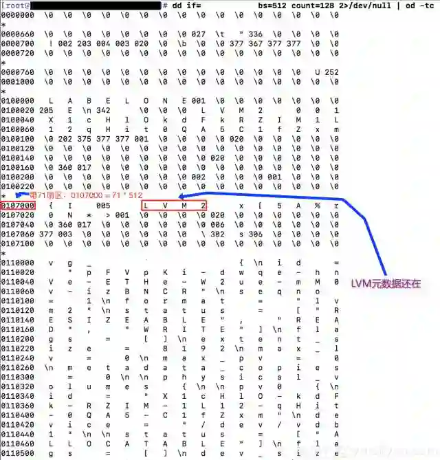 因为种种原因,我们不能确认分区信息和LVM备份数据为何不一致。但是,我们可以进一步从磁盘上提取、分析数据。因为有关分区的元数据在(分区在),所以我们进一步检查磁盘上还有没有有关LVM的元数据?这只要使用下面的命令行