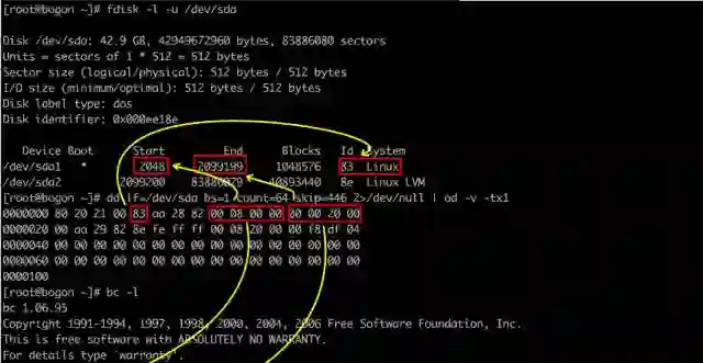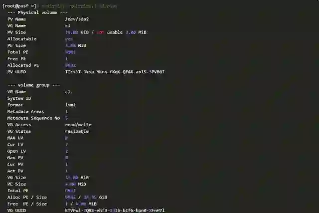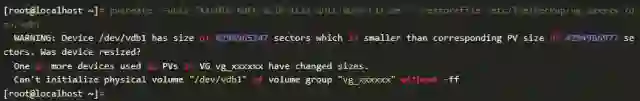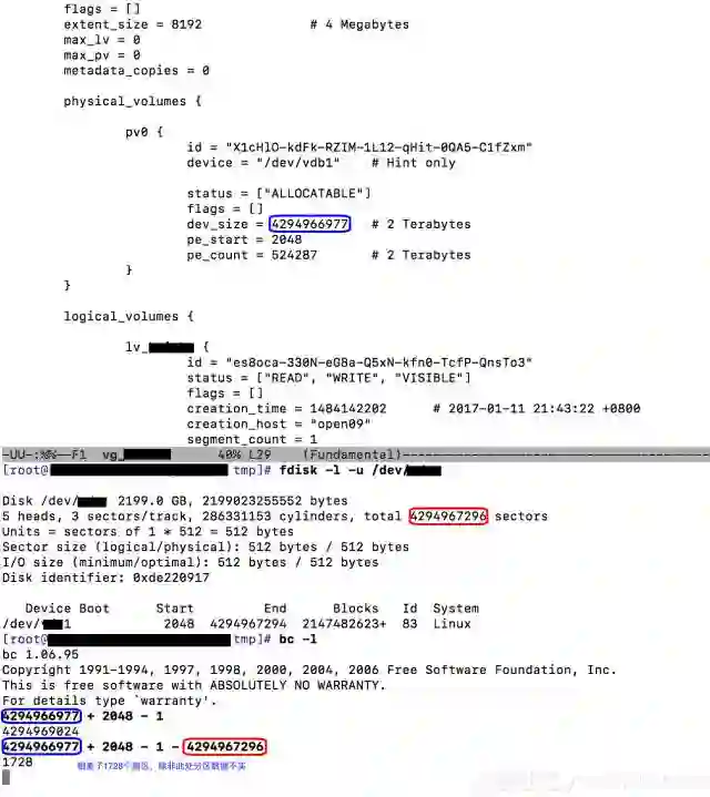 看样子,分区的数据有些地方出错了。根据上面命令报错的信息,对比LVM的备份数据和分区数据,很快我们就发现了问题。现有分区记录的其拥有的扇区数目,少于其上LVM卷组记录的扇区数量。