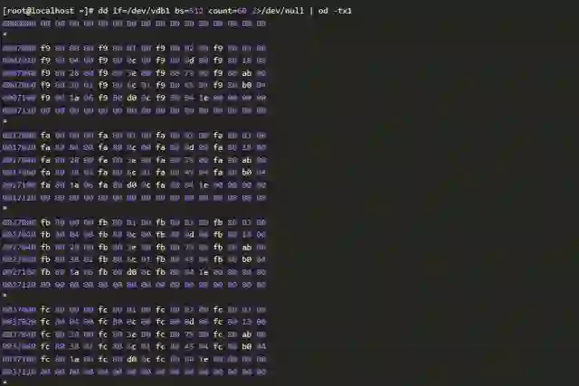 当然,也可以通过抽样检查来确认。这种方法通常是检查磁盘分区的前面一部分扇区。比如,下面的例子,通过检查前面几十个扇区,我们可以确认磁盘上确有数据。