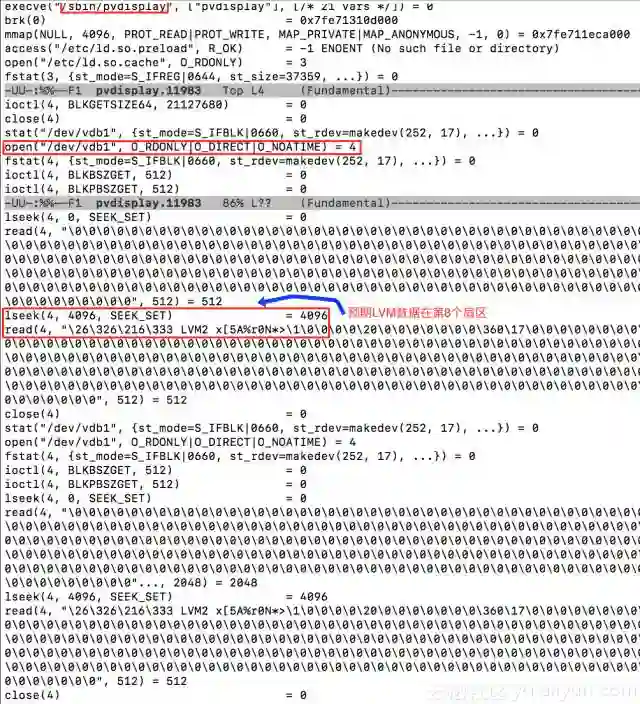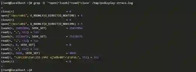 我们组合使用strace和grep命令来确认系统默认的LVM物理卷位置。如果你没有耐心分析下面的数据,请跳过直接看后面的截图
