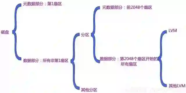 系统把磁盘的扇区分成两种来支持分区:第一扇区和所有其他非第一扇区。并且在第一个扇区上记录分区信息,即元数据。而其他非第一扇区则供分区层使用,从磁盘的视角看,其他非第一扇区则是数据部分。我们逐层考察下磁盘、分区和LVM结构