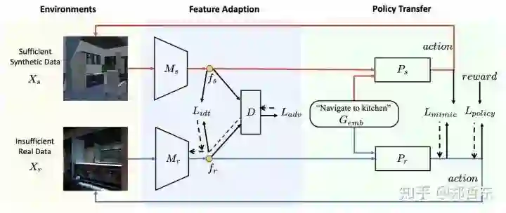基于强化学习的室内导航是最近的热点问题。机器人从室内随机一点出发,根据指令到达目标位置。由于3D重建的数据集相比于计算机图形学渲染的虚拟数据集采集较难而且数据量较小,这篇论文提出了一个端到端的模型,通过迁移学习的方法将虚拟数据集上的强化学习策略迁移到真实数据集上。论文从对抗学习和模仿学习两方面,分别完成了对底层图像特征和高维强化策略的迁移任务,并获得了比原有方法高20%以上的提升。