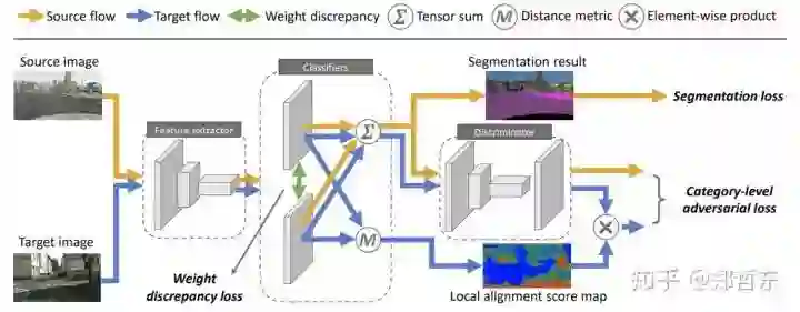 基于深度学习的语义分割方法效果出众,但需要大量的人工标注进行监督训练。借助于计算机虚拟图像技术,如3D游戏,可以获得几乎无限的自动标注数据。然而虚拟图像和现实图像间存在严重的视觉差异(域偏移),导致训练出的模型在真实图像数据集上的分割精度很低。传统方法利用对抗训练减少源域(S)和目标域(T)不同分布之间的差异,以加强网络在域间的泛化能力。然而该类方法只能对齐全局特征分布,忽略了同语义特征之间的语义一致性,在训练过程中容易造成负迁移。针对这一难点,作者采用了Co-training + Adversarial Training的方式,使用两个互斥分类器,根据分类器预测的差值来估计源域和目标域中特征的局部语义对齐程度,以此动态计算针对每类特征的对抗损失权重,解决了域适应语义分割中的语义不一致性问题和负迁移问题。