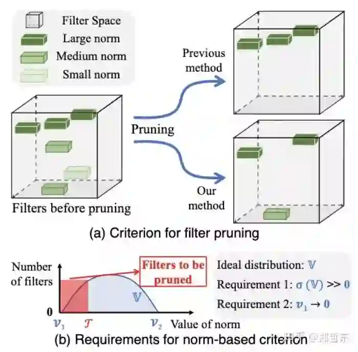 本文提出了新的基于滤波器的几何中心(geometric median)的剪枝算法,来对神经网络进行压缩和加速。现有的剪枝算法普遍认为,范数(Lp-norm)小的滤波器可以被去掉而不影响网络性能。由此对滤波器的范数有两个要求,一是滤波器范数分布的标准差要大,二是最小的范数要足够小。但是实际的经过预训练神经网络模型并不满足这两个要求,这导致一些重要的滤波器被错误地剪掉,影响了性能。本文从几何的角度出发,认为滤波器的几何中心含有所有滤波器共同的信息,因此临近几何中心的滤波器是可以被去掉的。这种新的剪枝方法,打破了以前的剪枝算法对滤波器范数的要求,提高了剪枝算法的适应性和并且取得了更好的性能。