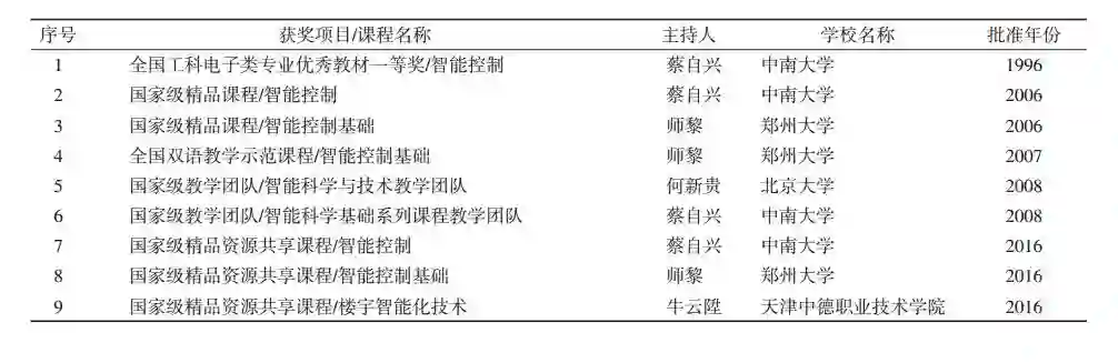表 5示出了入选国家级质量工程的智能控制类相关精品课程名单。这些课程仅是全国质量工程国家级课程很小的一部分。例如,国家教育部 2016 年 7 月15日公布第一批国家级精品资源共享课2686门,其中,本科教育课程1767门,高职教育课程 759门,网络教育课程 160门。而智能控制类课程虽然榜上有名,但只有 3门,约占 0.1%。不过,这些智能控制类课程来之不易,已在改革中不断发展壮大,并对全国智能控制教学发挥了重要的示范与辐射作用。