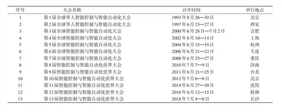 自 20世纪 90年代以来,国内对智能控制的研究进一步活跃起来,相关学术组织不断出现,学术会议经常召开。已成立了一些关于智能控制的学术团体,如中国人工智能学会智能控制与智能管理专业委员会及智能机器人专业委员会,中国自动化学会智能自动化专业委员会等。与智能控制相关的刊物,如《模式识别与人工智能》《智能系统学报》和《CAAI Transaction on Intelligence Technology》(《智能技术学报》)期刊等先后创刊。这些情况表明,智能控制作为一门独立的新学科,已在中国建立起来了。1993年由中国学者组织召开的首届“全球华人智能控制与智能自动化大会”,后修改更名为“智能控制与自动化世界大会”(World Congress on Intelligent Control and Automation,WCICA),至今已举行 13届,说明在中国已经形成智能控制学科,而且对国际智能控制的发展起到很大的促进作用。表 1简要介绍了历届智能控制与自动化世界大会的情况。