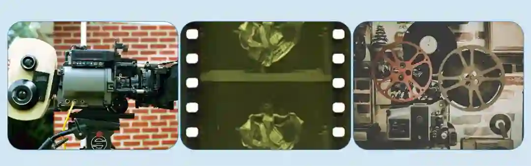 摄影机、电影《蝴蝶之舞》胶片与胶卷放映机。左一来自 UNsplash,其他来自维基百科