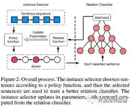 模型框架如图所示,左边是基于强化学习的 Instance Selector,右边是经典的基于 CNN 的 Relation Classifier。Instance Selector 根据 Policy function 对样本逐个筛选,每个样本都可以执行“选”或“不选”两种 Action,筛选完以后会生成一个新的数据集,我们用 Relation Classifier 来评估数据集的好坏,计算出一个 reward,再使用 policy gradient 来更新 Policy function 的参数,这里的 reward 采用的是数据集中所有样本的平均 likelihood。