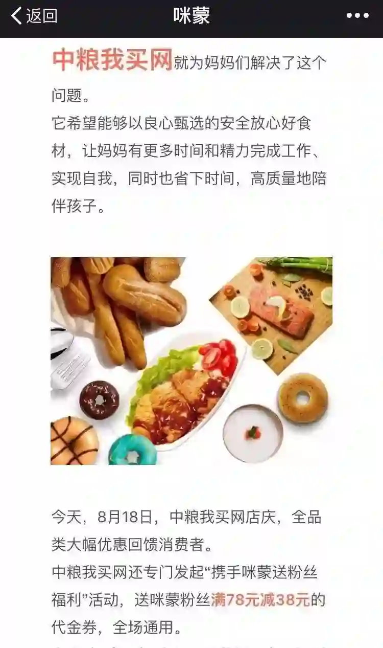 早在8月16日,咪蒙公号的三条也推送了名为《这有50份零食大大大大大大礼包,要送给你!》的预热文章,末尾提到通过留言上榜的50名粉丝,都能够拿到我买网专门打造的“咪蒙定制款”零食大礼包。而根据我买网提供的信息,这些价值500元的零食大礼包由咪蒙自掏腰包购买。当天晚上的推送还预告了我买网将在两天后的店庆日赠送大礼给咪蒙的粉丝,而在18日当晚的文章中,大礼的谜底揭开,中粮送给每位咪蒙粉丝“满78元减38元”的代金券。