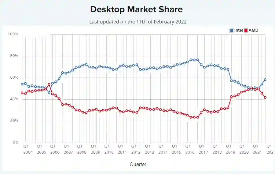 对于台式电脑,2019年AMD有32%的市场份额,截至2021年,英特尔和AMD的市场份额是50/50。
