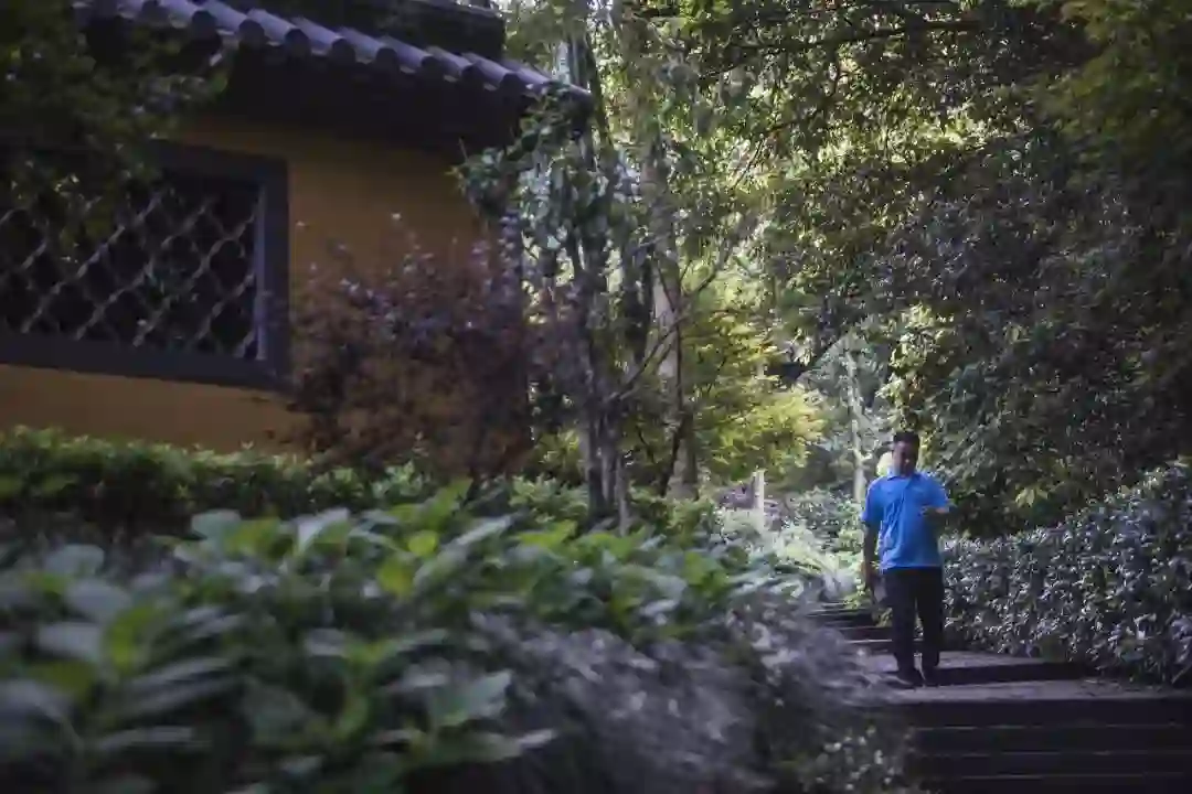 从王修宾所在的片区出发,向东北方向开 180 公里,就能抵达“佛系快递员”程楚超所负责的片区。那是位于杭州西湖边连绵群山中的千年古刹群:灵隐寺、法喜寺、永福寺、法净禅寺、法镜寺、韬光寺……不同于王修宾穿梭于居民楼和写字楼之间,程楚超每天的工作是在溪水潺潺、林木苍翠间拾级而上,为生活寺里的出家人收寄快递。