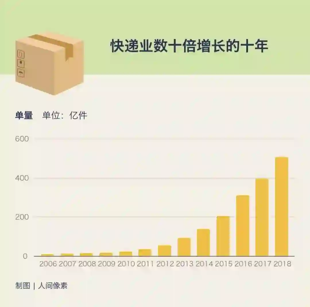 从 1980 年到 2000 年,中国快递用了 20 年的时间才使业务量达到 1 亿件,从 1 亿到 10 亿花了 6 年,之后 2006 年到 2014 年,从 10 亿件跨到 100 亿件。国家邮政局今年发布的数据则显示,2018 年全年全国快递业务量达到 507.1 亿件。
