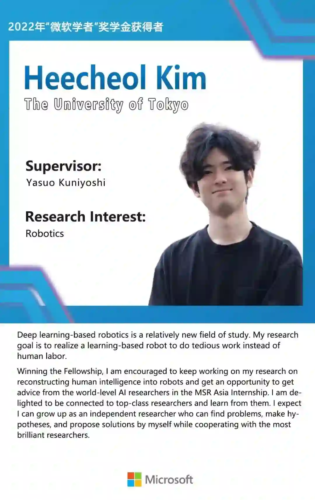 2022年“微软学者”奖学金共吸引了来自亚太地区顶尖研究型大学及机构的近两百名优秀博士生申请,申请者的研究领域广泛分布于计算科学、硬件与软件系统、人类与机器智能,及感知、识别与交互等领域。获奖者们具有广阔的视野,致力于做出有价值的科研工作,并且期待以科研带来切实的社会价值,造福世界。