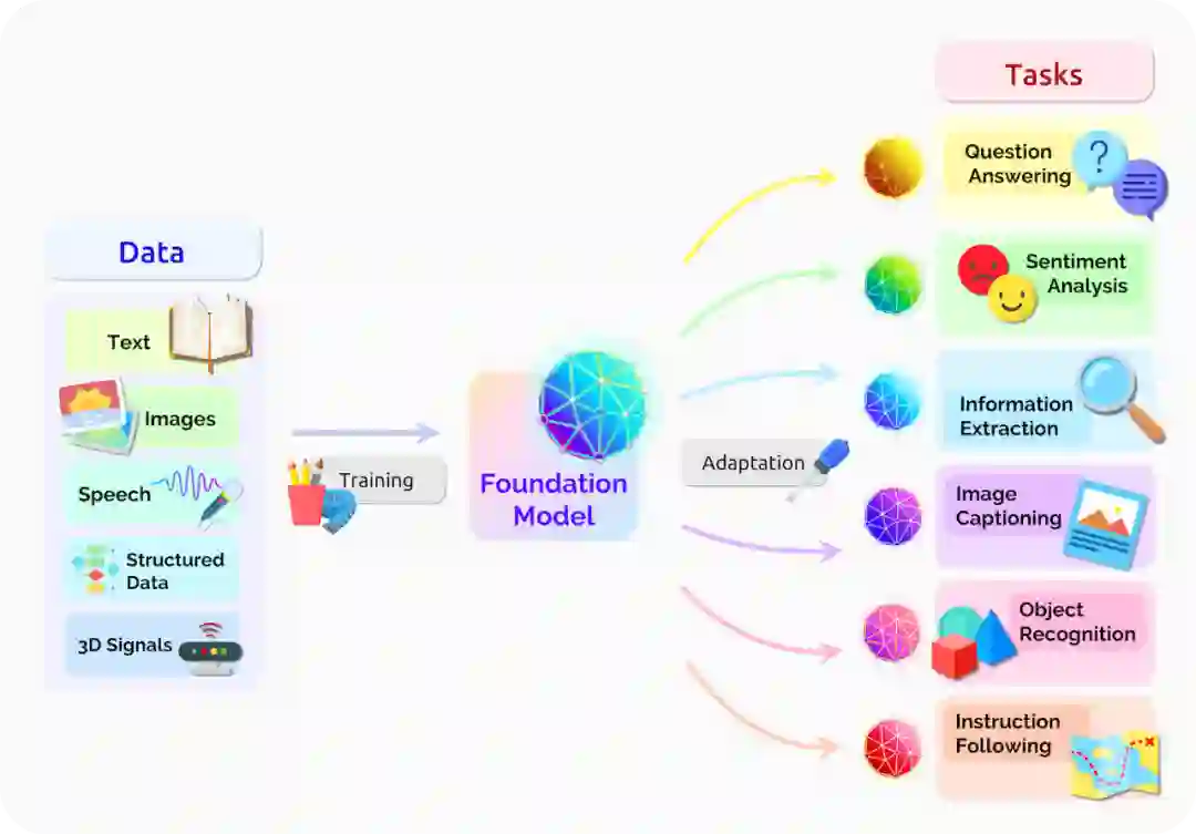 基础模型可以集中来自各种模态的所有数据的信息,然后这个统一模型可以适配各种下游任务。