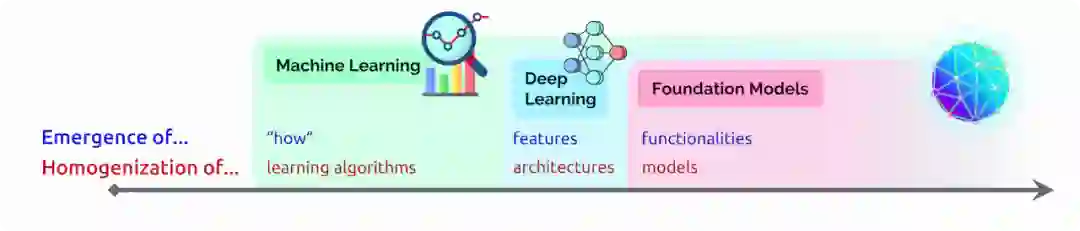 图1 人工智能的故事一直是不断涌现或是不断同质化。随着机器学习的引入,任务从例子中学习如何执行(自动推断);通过深度学习,涌现了用于预测的高级特征;有了基础模型,甚至涌现了上下文学习等高级功能。与此同时,机器学习使学习算法同质化(例如,逻辑回归),深度学习使模型架构同质化(例如,卷积神经网络),基础模型使模型本身同质化(例如,GPT-3)