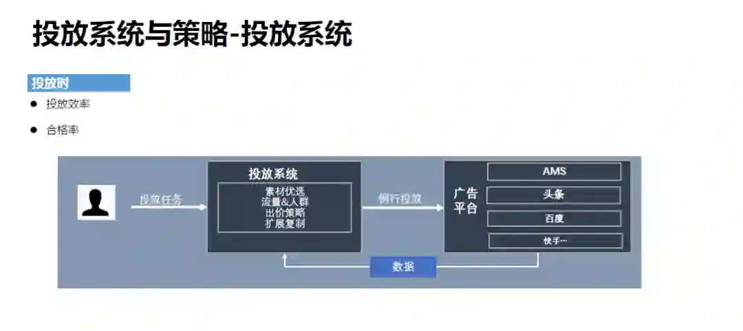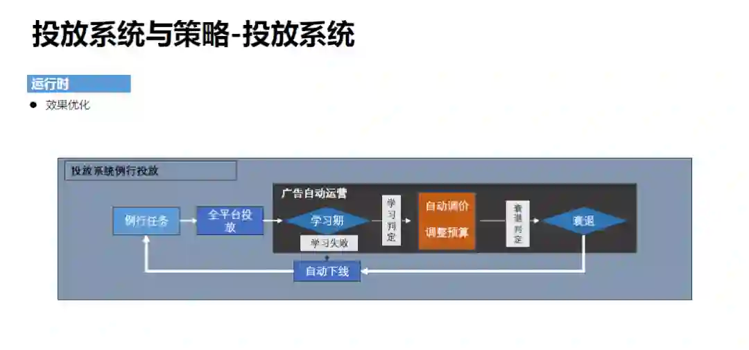 投放系统主要是解决自动化投放和扩量的投放过程。基于投放策略模型、投放效果数据,构建了自动化投放链路。通过模型拟合自动化规则引擎,管理和运营投放的广告,达到了客户获量的水平,以及合格率的水平。