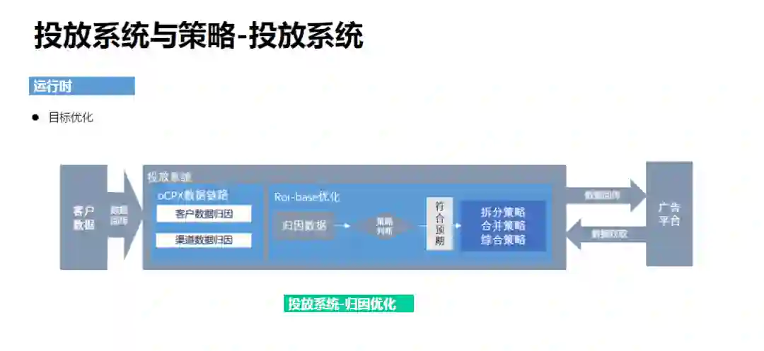 接下来,介绍我们在归因方面的策略。大部分的广告主投放方式是oCPX方式。oCPX数据链路会涉及客户数据归因和渠道数据归因。在归因方面,也有很多策略工作。我们会驱动媒体平台挑选指定的数据回传到广告平台,从而驱使广告平台的模型学习我们想要的用户特点。比如,在目标ROI的归因过程中,会对大R用户会进行拆分的策略,小R用户会进行合并的策略,对于在同一个媒体平台不同地方有多个点击归因的用户,会根据策略选择归并到不同的点击中。通过不同的归因策略,帮助媒体平台寻找到想要的用户。