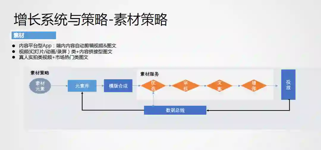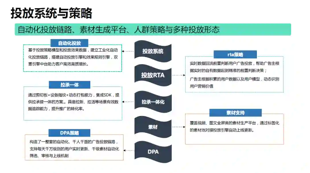 投放素材方面,我们搭建了一个覆盖视频、图文全屏类的素材生产平台,通过标签化的素材池、以及结合投放效果自动化优选素材的过程,来做到更大投放量的承载。