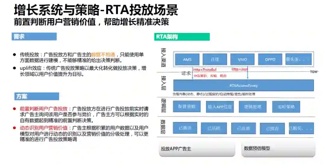 刚才主要是介绍了广告投放平台,以及一些自动化运营策略。接下来介绍RTA的投放策略。RTA的存在主要是由于媒体平台和广告主的数据处于割裂状态,双方的数据互不相通;除了oCPX有一些标准化的数据回传,对于一些高付费用户和高质量用户,广告主方和媒体方处于互不信任的状态。RTA是通过接口的形式,在广告投放过程中,对用户建模,决策用户是否进行投放。在我们的场景中,首先通过RTA实现共同建模;其次,有别于传统投放倾向于获量,增长场景中更倾向于uplift效应。
